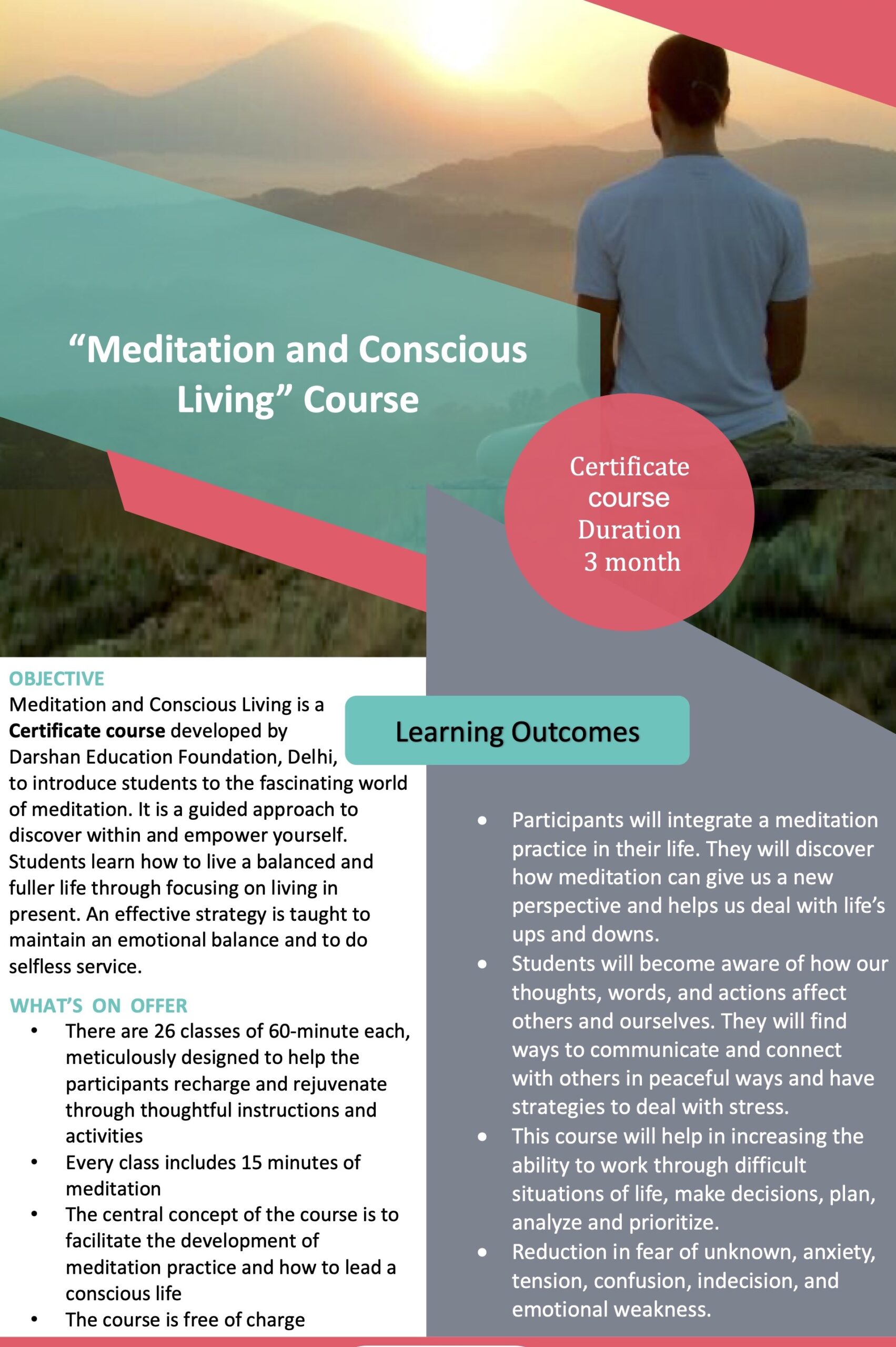 Meditation and Conscious Living is a Certificate course developed by Darshan Education Foundation, Delhi, to introduce students to the fascinating world of meditation. It is a guided approach to discover within and empower yourself.